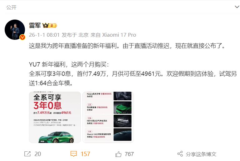 2026年1月1日,雷军在其微博发文称:“这是我为跨年直播准备的新年福利。由于直播活动推迟,现在就直接公布了。 YU7 新年福利,这两个月购买, 全系可享3年0息,首付7.49万,月供可低至4961元。欢迎假期到店体验,试驾另送1:64合金车模。”